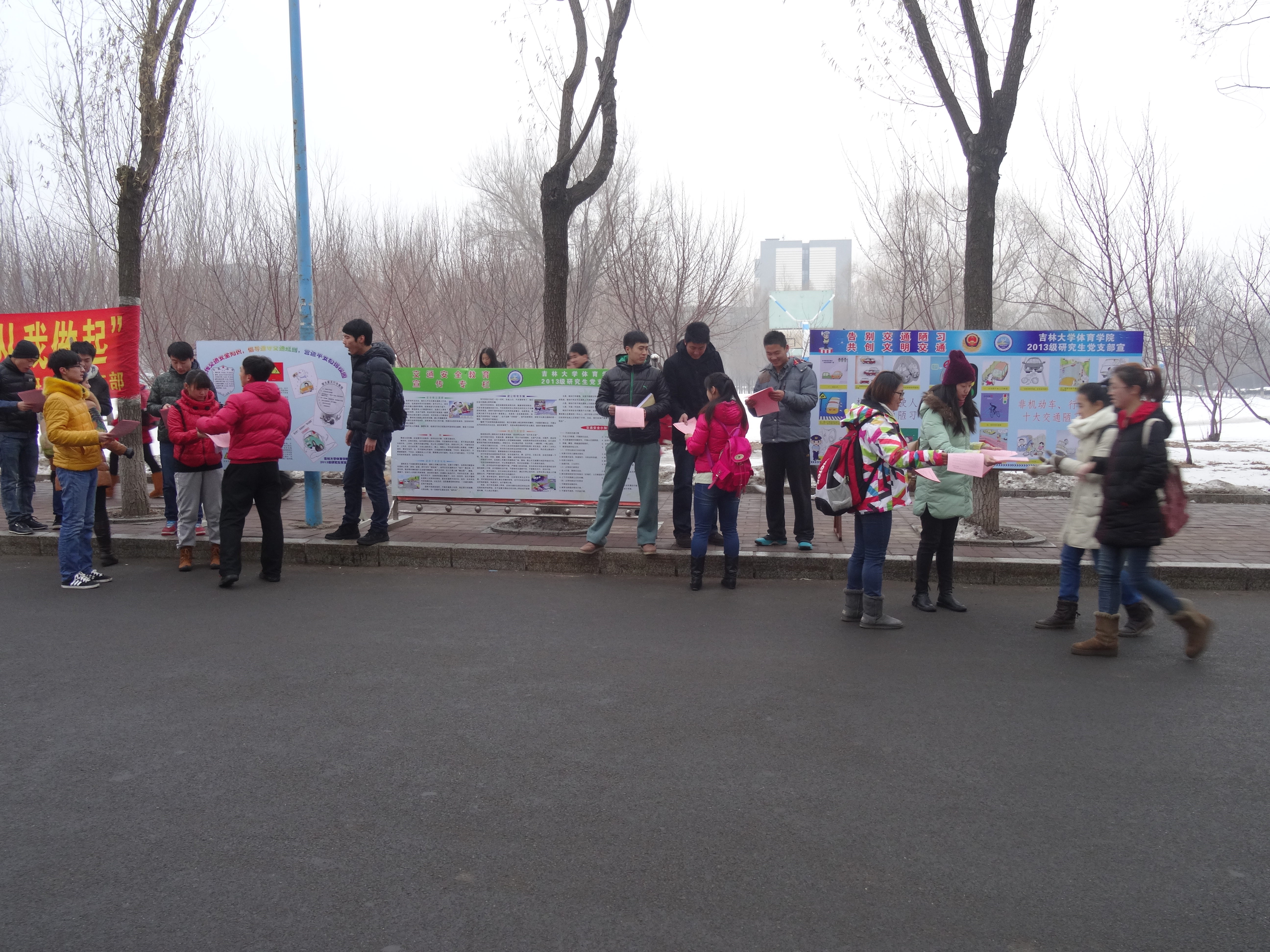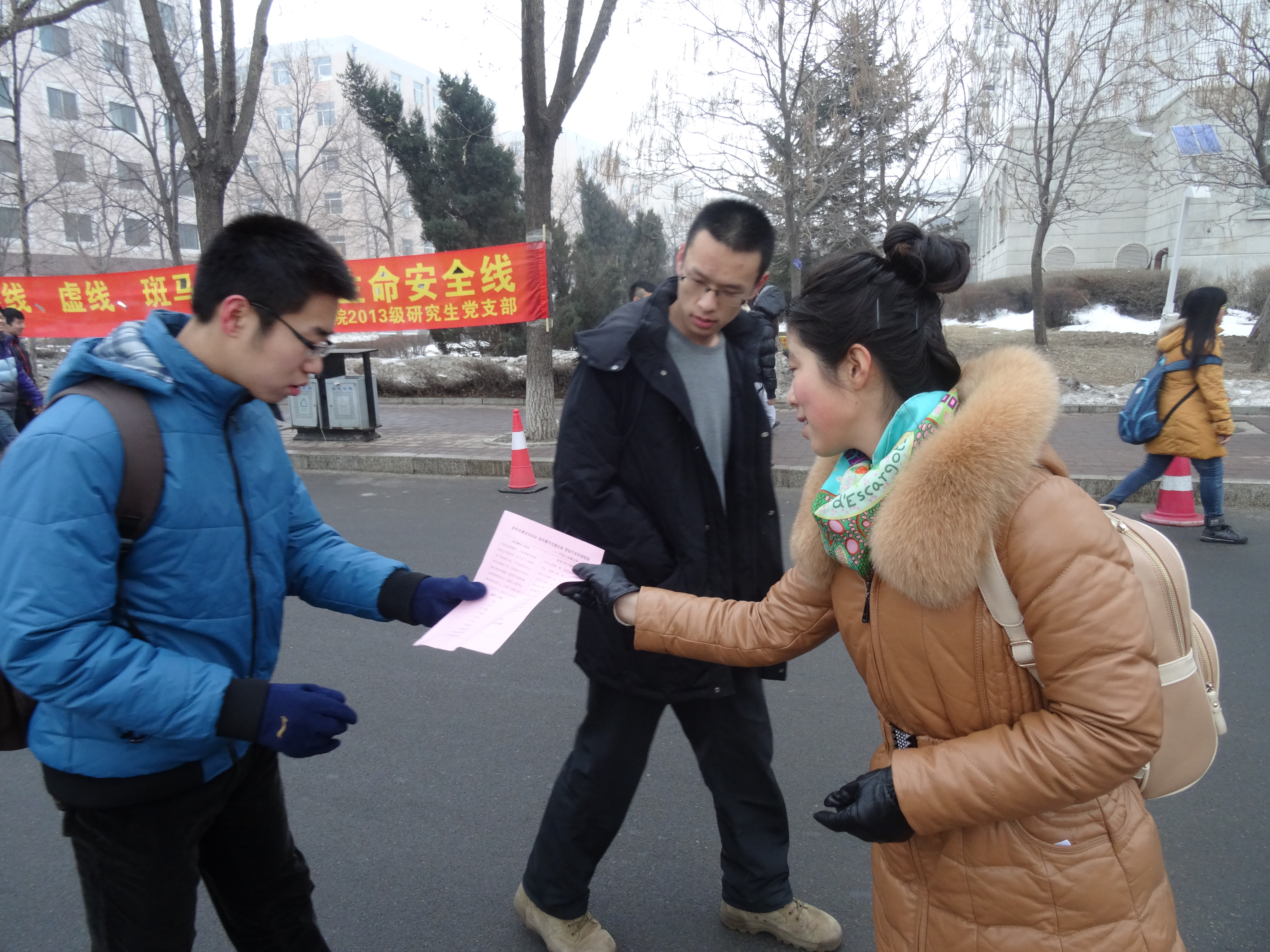 本次活动使beats365亚洲版官网研究生党支部在开展党的群众路线教育实践活动以来,深入到基层,到广大同学中去,通过倾听、观察、交流和自身体会,发现在校园交通中,员工作为校园交通参与主体存在着如:1、不少同学缺乏交通安全知识2、部分同学作为机动车驾驶者法制观念淡薄,3个别同学安全意识差自我防范能力弱,4新生同学对东北冬季气候特点不熟悉,对交通情况估计不足等问题,使校园交通存在一定安全隐患,公司研究生党支部以此为切入点开展研究,在2013年校研究生党支部群众路线教育实践活动创新立项中,以“宣传交通安全知识 倡导遵守交通法规 营造平安和谐校园”为题荣获重点立项1项,近期又恰逢12月2日“全国交通安全日”今年的主题是“摒弃交通陋习,安全文明出行”选在近期开展活动也更有意义,更能引起员工共鸣。