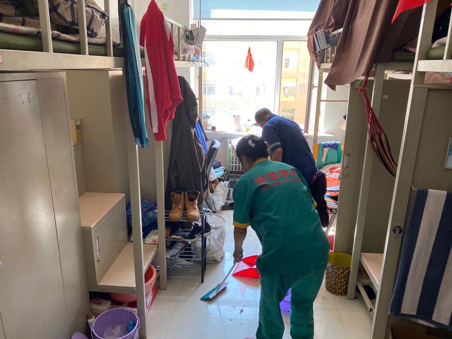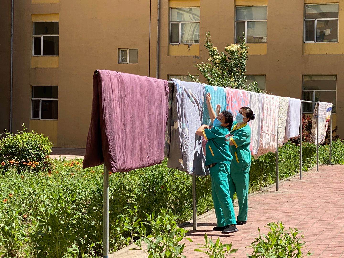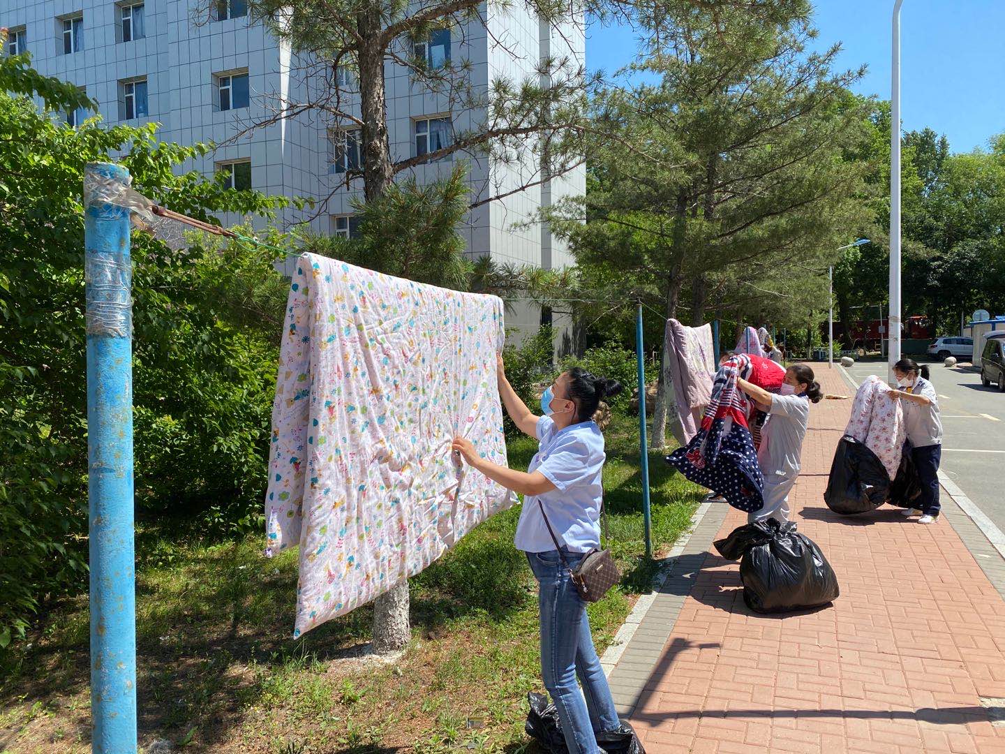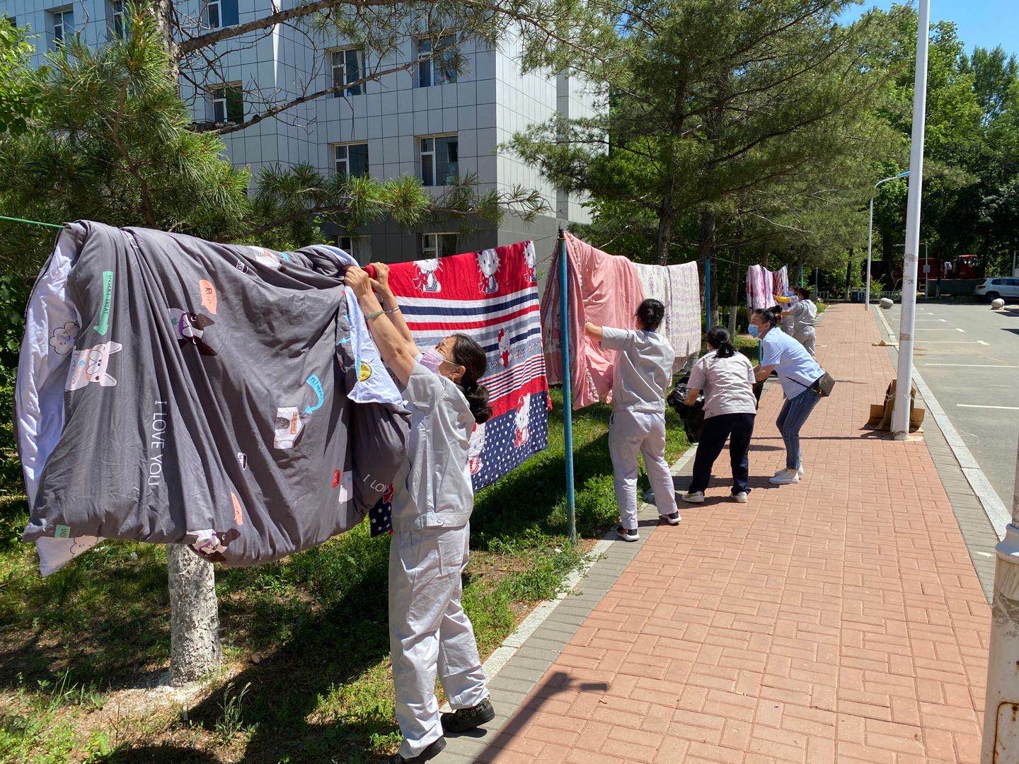 6月16日上午9点,beats365亚洲版官网辅导员、前卫校区后勤服务中心公寓部工作人员、明德物业工作人员聚集在员工公寓门前,按照事先整理好的有诉求员工名单,逐一房间为员工晾晒被褥、清理垃圾。工作人员早已准备好名帖,分别在公寓床、被褥上做好标记,防止物品弄混、丢失。大家分工明确,擦栏杆、取被子、夹标签、晒被子、收回等一整套流程,全部由专人负责。最后,物归原位,叠得整整齐齐。