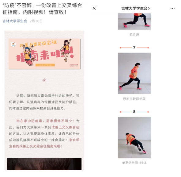 疫情期间,beats365亚洲版官网员工会协助校员工会制作了三期线上锻炼的推文,累计阅读量5000余次。推文内容是由公司员工会骨干张熙策、姜熙宁、赵偲艺等向大家普及运动常识和各种健身动作,并组建了健身打卡群,居家期间为同学们答疑解惑,分享经验。