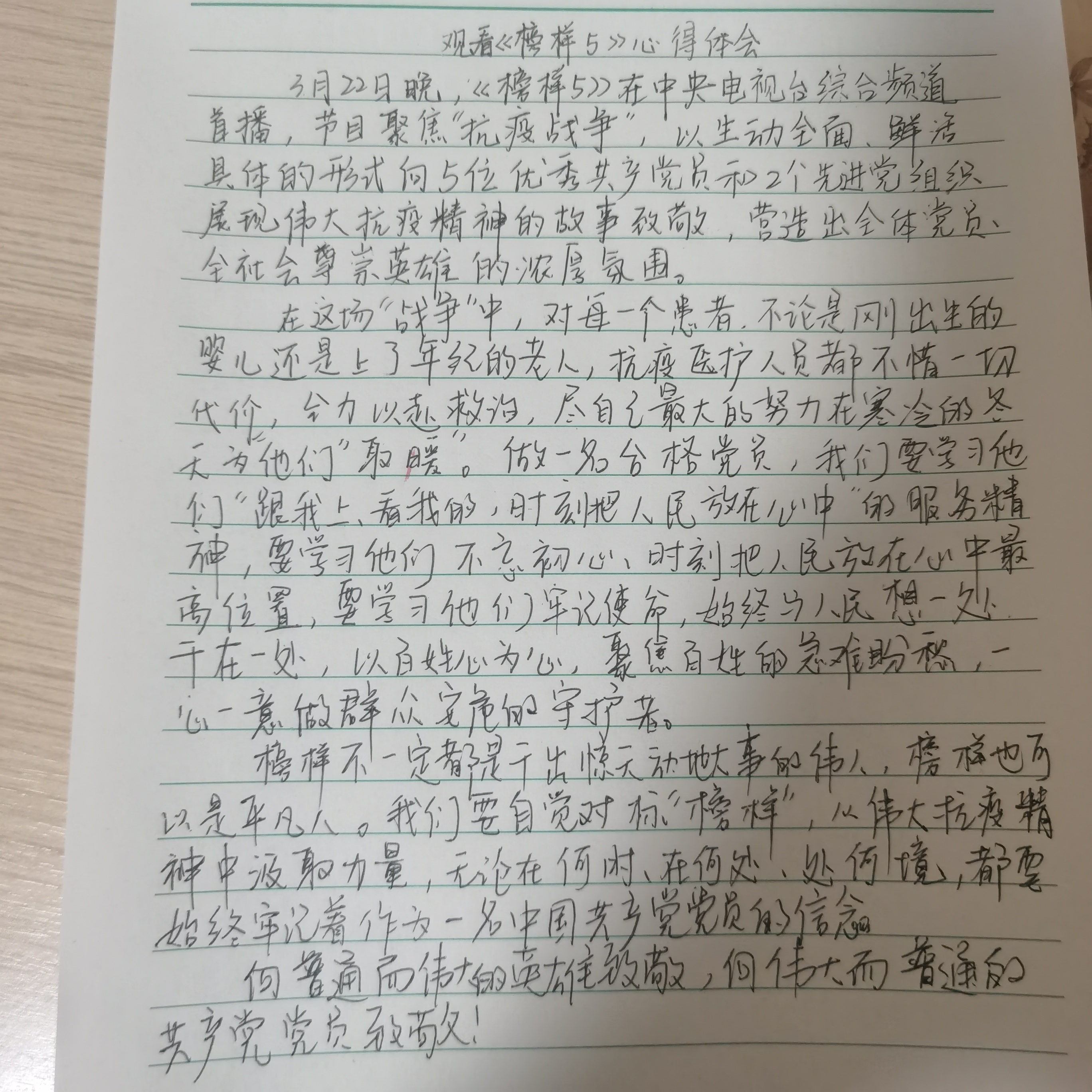 在观看《榜样5》后,员工党员用文字表达了自己的真实感受,写出了节目中令自己印象深刻的党员事迹和精神,纷纷表示要向榜样看齐,从榜样的身上汲取更强大的力量,时刻鞭策自己,不忘初心、牢记使命,勇于担当、甘于奉献,无不为榜样的力量为之动容。