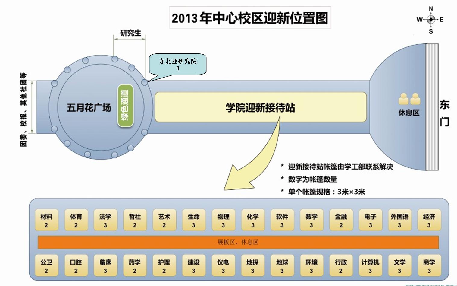 2.各单位须于8月22日12:00前在所在校区内设立研究生新生接待站。中心校区、南岭校区有本科生的培养单位研究生新生接待站可以和本单位本科生新生接待站设在一处,具体位置见附件1;中心校区没有本科生的培养单位可在公司指定的区域设置研究生新生接待站,也可在本单位办公楼或教学楼前设立研究生新生接待站;环境与资源公司在北区理化楼门前设立研究生新生接待站;理论化学研究所在北区一舍门前设立研究生新生接待站。新民校区各培养单位由医学部人才培养办公室负责在学部办公楼门前集中设立研究生新生接待站。朝阳校区各培养单位在员工一公寓楼前东西主干道集中设立研究生新生接待站。南湖校区各培养单位在正门里侧区域设立研究生新生接待站。和平校区各培养单位由农学部研究生处负责设立研究生新生接待站。
