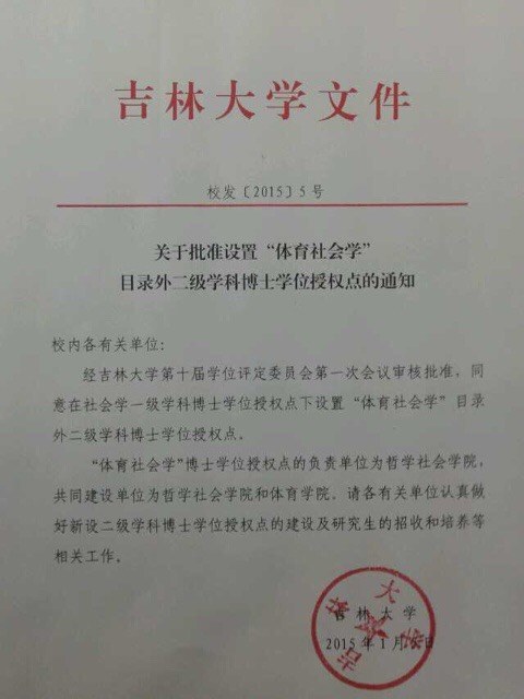 经公司第十届学位评定委员会第一次会议审核批准,同意在社会学一级学科博士学位授权点下设置“体育社会学”目录外二级学科博士学位授权点。